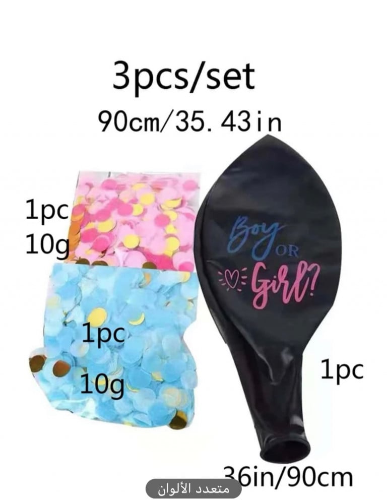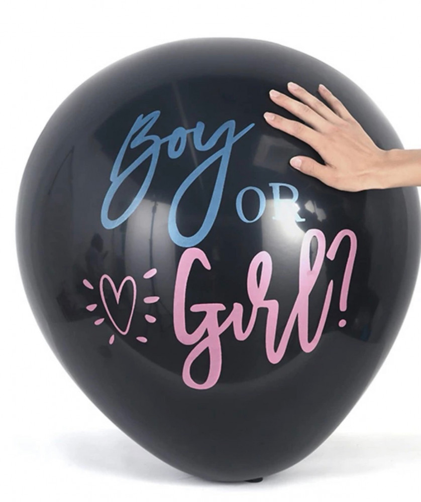 بالون كبير أسود بكتابة وقصاصات وردي وأزرق للأعلان جنس الجنين في حفلة كشف جنس الجنين 💙💕 ، يقوم الوالدان باختيار لون القصاصات المناسب ووضعه داخل البالونة ونفخ البالونة بالهيليوم ثم يستمتعو باجمل انفجار بالون يملئ الجو بلون جنس الجنين .
