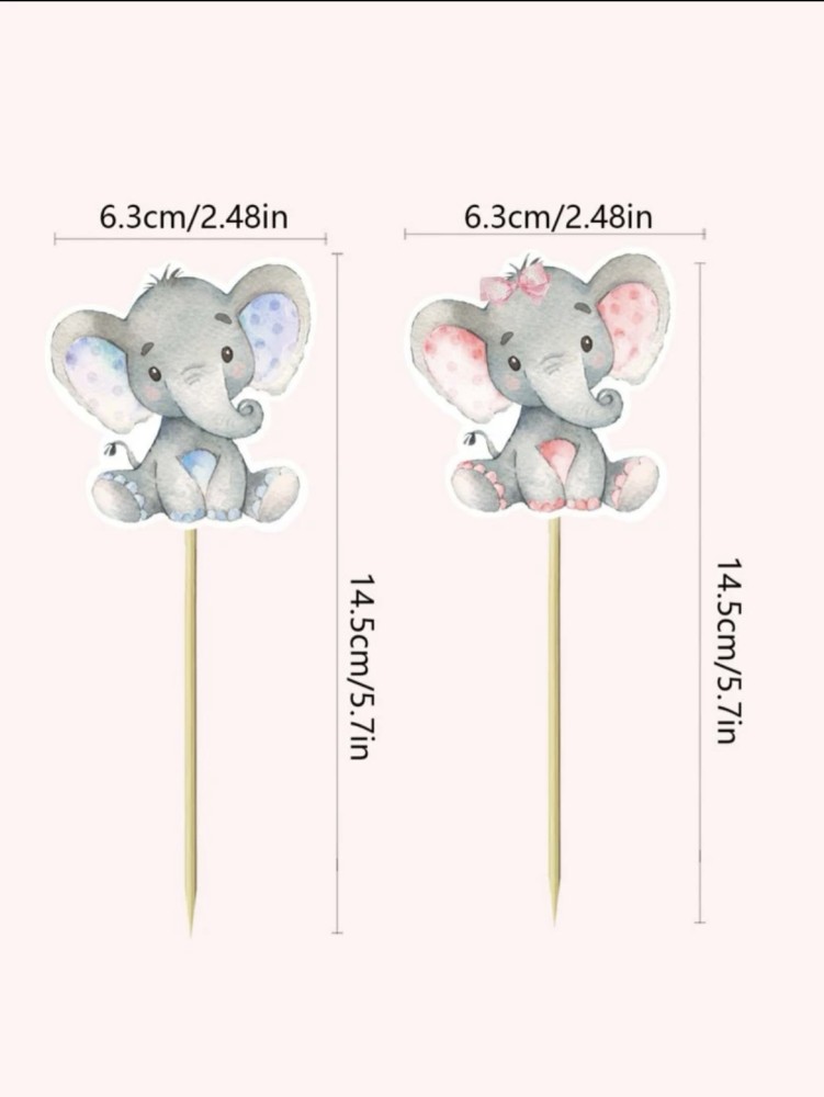 تغريسات كب كيك لحفل كشف جنس الجنين أو تغريسات قطع الكيك الصغيرة وتحتوي على رسومات الفيل اللطيف الوردي يدل على البنت والفيل اللطيف الأزرق يدل على الولد.