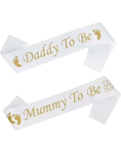 وشاح للأم والاب ابيض وذهبي لحفل كشف جنس الجنين